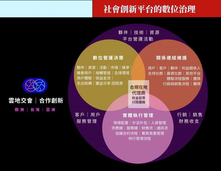 全功能平台支持各種尺度與類型的社會創新活動。在論壇對話中生產知識與營運模式,用雲端工作室建立數位組織與網絡服務。每一階段都可在真實營運活動中,累積獲得知識,社會與經濟的資本。